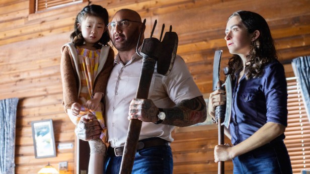 Eric (Jonathan Groff) and Andrew (Ben Aldridge) are a same-sex couple who have taken their seven-year-old adopted daughter Wen (Kristen Cui) to a remote cabin for a vacation. Their peaceful trip is interrupted when Leonard (Dave Bautista), Sabrina (Nikki Amuka-Bird), Adriane (Abby Quinn) and Redmond (Rupert Grint) arrive at the cabin on an unbelievable mission: to convince the family of three to willingly kill one of themselves to prevent the coming of the apocalypse and save the world.